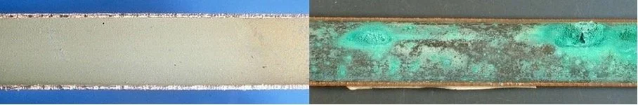 Dwarsdoorsnede van twee koperen leidingen. Door waterbehandeling met een BlueRex systeem ontstaat er een beschermende laag aan de binnenkant van de waterleiding. Links is deze laag duidelijk zichtbaar. Rechts: een waterleiding met zichtbare putcorrosie.