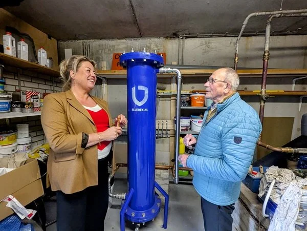Gesprek met huismeester Nico van Zanten bij het BlueRex systeem in de hydrofoorruimte